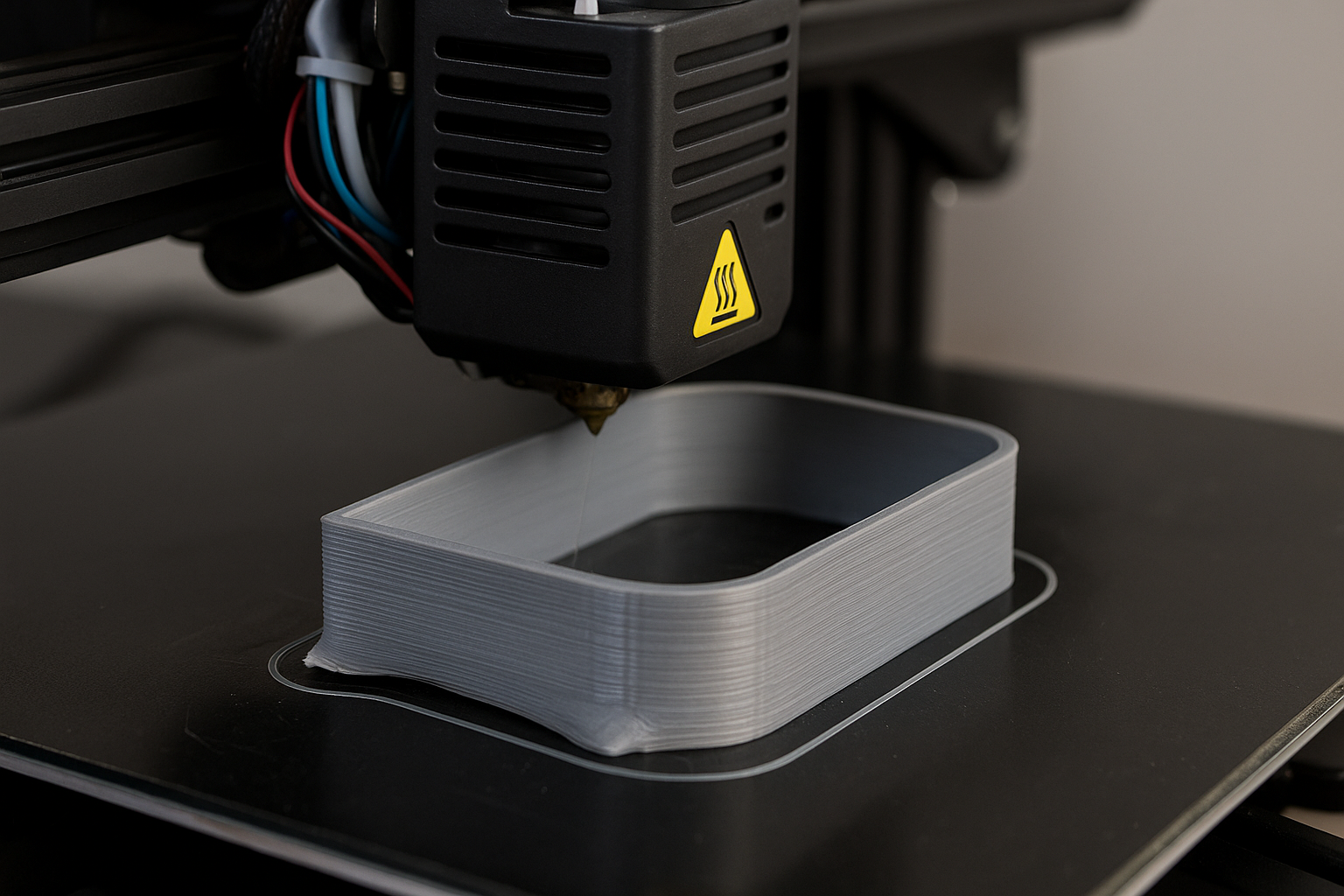 Le warping apparaît lorsque la pièce refroidit de manière non uniforme. Le plastique se contracte en refroidissant : si les couches du bas (proches du plateau) et celles du haut ne se contractent pas au même rythme, des contraintes mécaniques s’accumulent. Résultat : les coins se soulèvent, les parois se cintrent, ou la pièce “banane”. Plus la pièce a une grande surface au contact du plateau, des angles vifs, ou une géométrie fine et longue, plus le risque augmente.